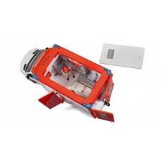 Red and white toy ambulance with open roof view, showing detailed interior and lifeguard figure inside.
