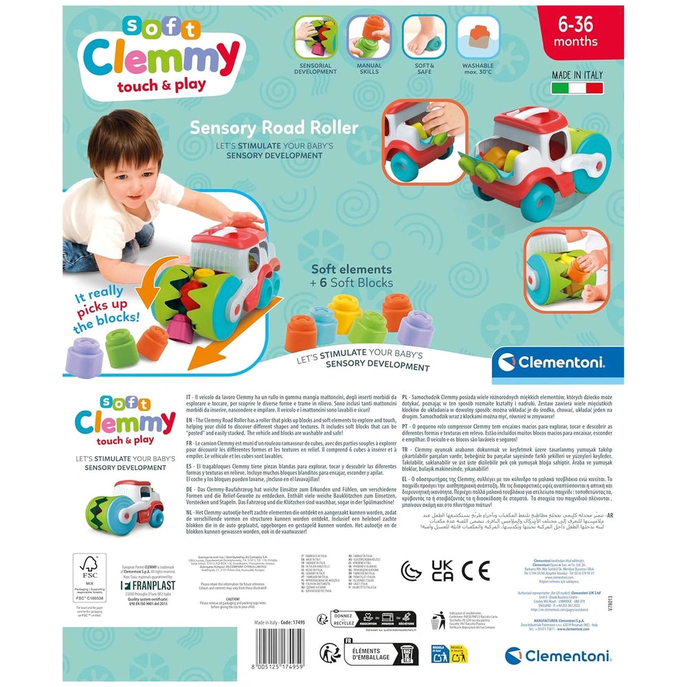 Clementoni - Rouleau de route sensoriel Soft Clemmy Touch & Play Découvrez le rouleau de route sensoriel Soft Clemmy Touch & Play de Clementoni, un jouet d'activité innovant conçu pour éveiller et stimuler les sens de votre enfant tout en favorisant la créativité et la motricité fine. Ce véhicule charmant sert de collecteur pour des blocs de construction souples, présentant diverses textures qui encouragent l'exploration et le jeu imaginatif. Conçu dans un souci de sécurité, le rouleau de route Soft Clemmy est parfait pour les petites mains désireuses d'apprendre et de découvrir. Le rouleau de route sensoriel n'est pas qu'un simple jouet ; c'est une expérience multi-sensorielle qui captive les jeunes esprits. Le design unique du véhicule permet aux enfants d'interagir avec différentes textures, améliorant ainsi leur perception tactile. Des blocs souples aux couleurs vives peuvent être insérés et extraits du rouleau, offrant d'innombrables possibilités de jeu imaginatif. En manipulant les blocs, les enfants développent des compétences essentielles telles que la coordination main-œil et la dextérité, tout en s'amusant. Jouer avec le rouleau de route Soft Clemmy est une activité engageante qui encourage l'exploration sensorielle. Les enfants peuvent ressentir les différentes textures du véhicule, ce qui les aide à comprendre le monde qui les entoure. Les blocs souples peuvent être utilisés de manière indépendante ou roulés par le véhicule, transformant le rangement en un jeu à part entière. Ce jeu interactif divertit non seulement, mais favorise également le développement cognitif alors que les enfants apprennent à associer couleurs, formes et textures. Fabriqués en Italie, les jouets Soft Clemmy de Clementoni sont conçus à partir de matériaux souples, lavables et non toxiques, garantissant leur sécurité pour les bébés de 10 mois et plus. Les parents peuvent être rassurés en sachant que ces jouets sont conçus avec le plus grand soin pour la sécurité et l'hygiène. Les blocs sont non seulement sûrs à mettre dans la bouche, mais également suffisamment durables pour résister aux rigueurs du temps de jeu, ce qui en fait un choix fiable pour les tout-petits actifs. Les blocs Soft Clemmy brevetés sont une caractéristique remarquable de ce produit. Ils sont conçus pour être légers, faciles à saisir et parfaits pour les petits à lancer, piétiner ou mâcher sans aucun risque. Avec leurs couleurs vives et leurs textures douces, ces blocs offrent une expérience sensorielle délicieuse qui captive l'attention des enfants et les encourage à explorer leur créativité. En conclusion, le rouleau de route sensoriel Soft Clemmy Touch & Play de Clementoni est un ajout essentiel à la collection de jouets de votre enfant. Il combine amusement, sécurité et valeur éducative dans un ensemble engageant. Ne manquez pas l'opportunité d'enrichir le temps de jeu de votre enfant avec ce jouet sensoriel unique. Commandez le rouleau de route Soft Clemmy aujourd'hui et regardez votre petit embarquer pour un voyage de découverte et de créativité !