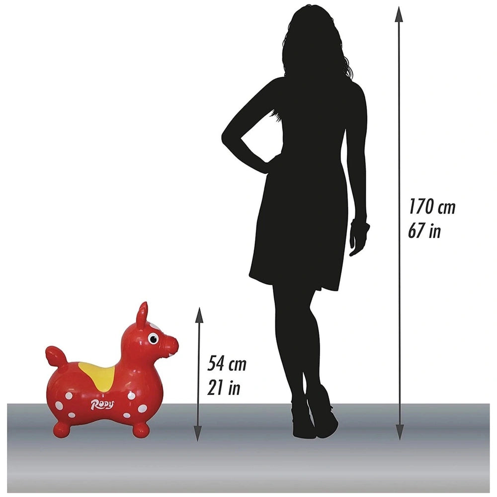 Introducing the Gymnic Rody Riding Toy Jumping Horse in vibrant red, a timeless classic that has captivated children since its debut in 1984. This inflatable ride-on toy is not just a source of endless fun; it also serves as an exceptional tool for developing essential motor skills in young children. With its engaging design and playful demeanor, Rody encourages active play while promoting physical development, making it an indispensable addition to any child's toy collection.