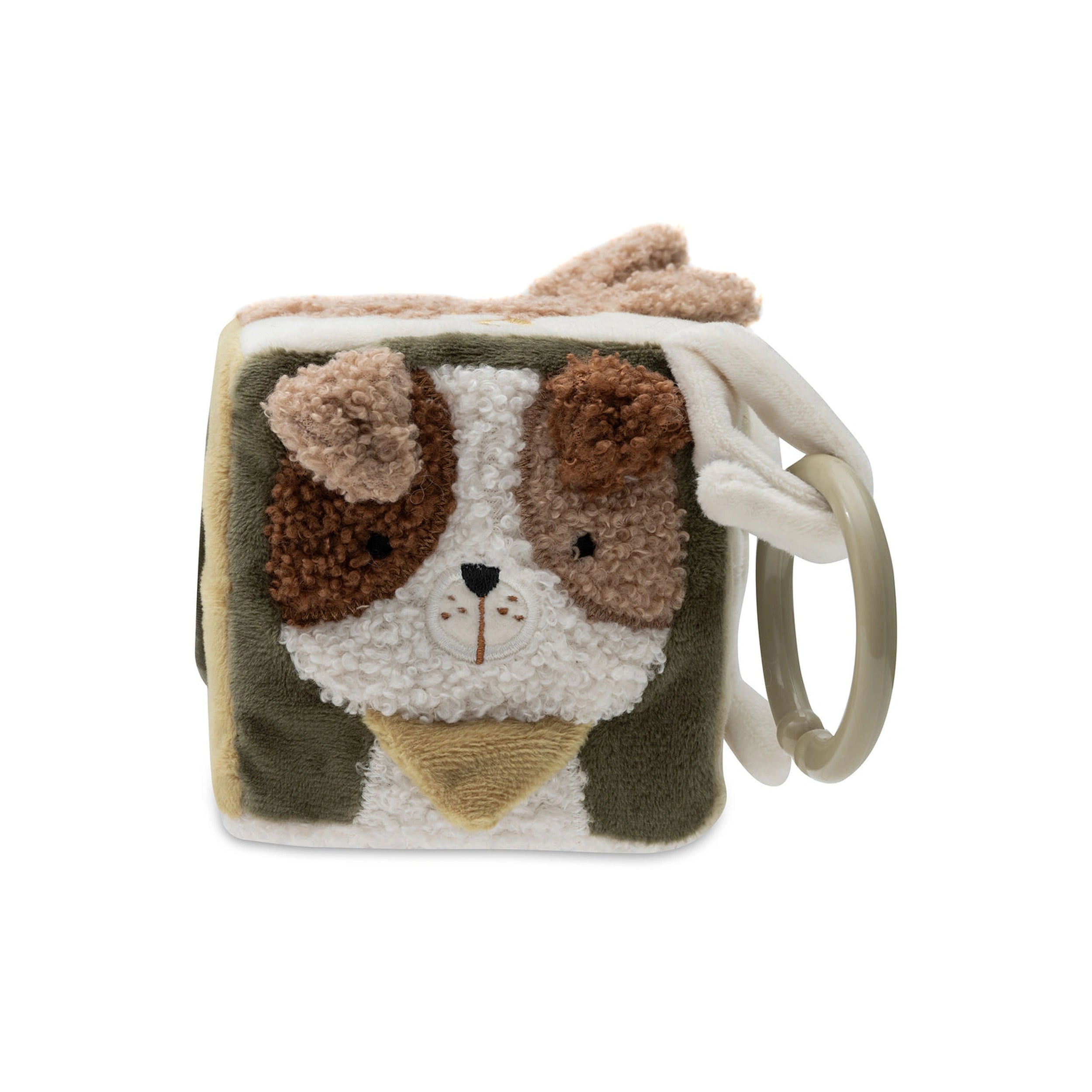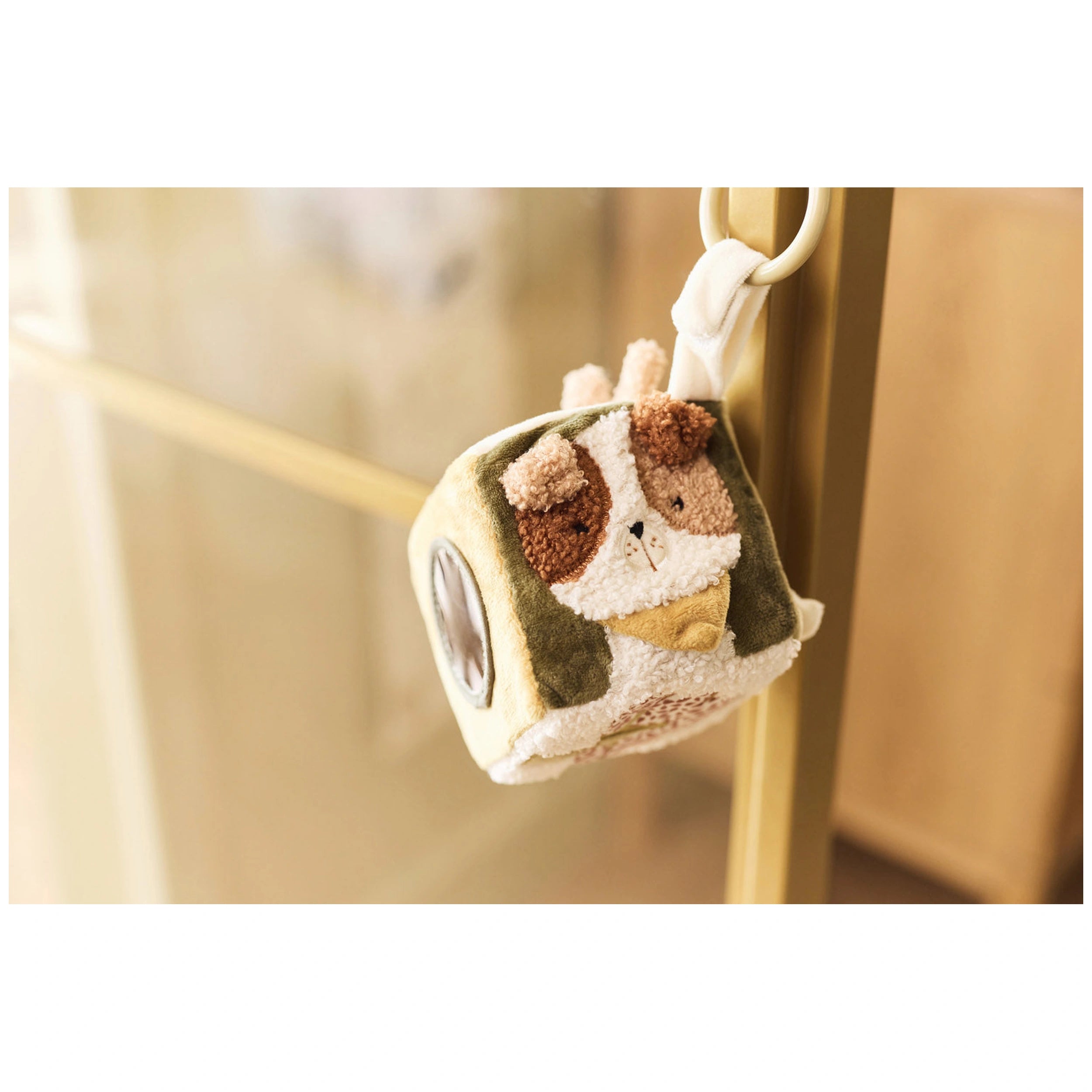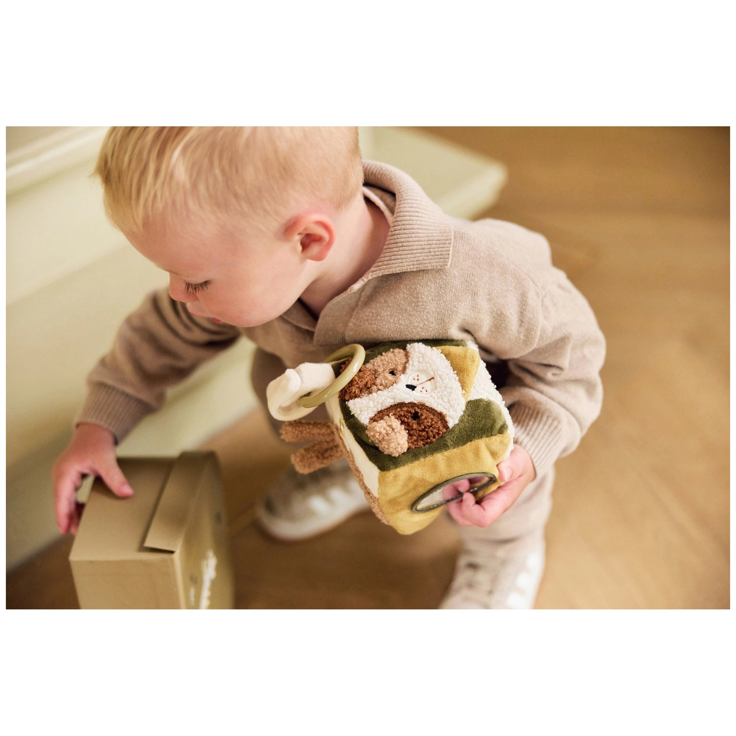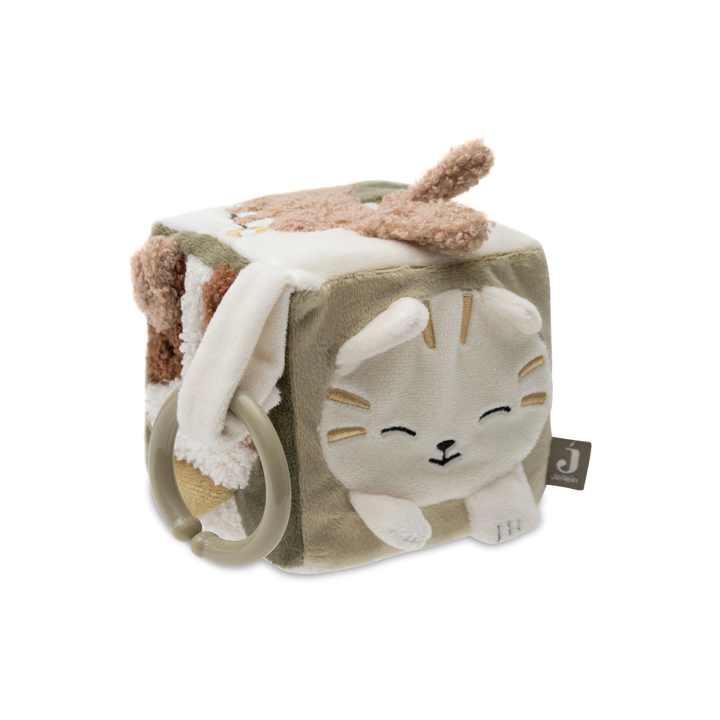 Introducing the Jollein Activity Cube from the Tiny Park collection, a delightful addition to your baby's toy collection. This enchanting soft activity cube is designed to engage your little one’s senses while promoting essential motor skills. With its charming animal characters, including a cat, dog, and owl, this toy is not only visually appealing but also serves as an interactive learning tool for infants.