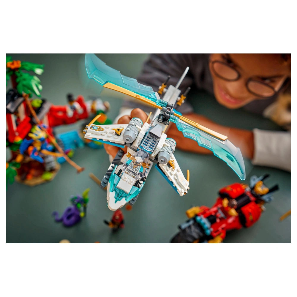 LEGO - Ninjago Ninja Vehicle Tree House Battle - Ensemble de construction Découvrez le LEGO Ninjago Ninja Vehicle Tree House Battle (71857), un ensemble de construction palpitant conçu pour les garçons et les filles de 7 ans et plus. Ce playset dynamique permet aux jeunes bâtisseurs de s'immerger dans le monde rempli d'action de Ninjago, inspiré par la saison 4 passionnante de l'émission télévisée NINJAGO® Dragons Rising. Avec un total de 642 pièces, cet ensemble offre d'innombrables possibilités de jeu imaginatif et de narration créative, en faisant un ajout parfait à toute collection LEGO. Le point central de cet ensemble est l'impressionnante maison dans les arbres à 3 étages, qui présente une variété d'éléments engageants. Les enfants peuvent explorer l'atelier, se détendre dans le salon de thé ou s'aventurer sur la terrasse. La maison dans les arbres est équipée de fonctionnalités interactives telles qu'une corde de vigne balançante, un piège qui libère une petite pierre, un pont tournant et un tireur à studs, garantissant que chaque session de jeu soit remplie d'excitation et d'aventure. Cette structure à plusieurs niveaux sert non seulement de champ de bataille mais aussi de centre de créativité et d'exploration. En plus de la maison dans les arbres, l'ensemble comprend deux véhicules ninja palpitants : une moto et un hélicoptère. La moto dispose de roues mobiles, d'un cockpit-selle pour une minifigure et de deux tireurs à studs, permettant des courses à grande vitesse et des échappées audacieuses. Pendant ce temps, l'hélicoptère possède un cockpit ouvrant et des pales rotatives, parfaites pour des manœuvres aériennes et des attaques stratégiques. Ces véhicules améliorent l'expérience de jeu, fournissant aux enfants les outils nécessaires pour recréer leurs scènes de bataille préférées ou en inventer de nouvelles. L'ensemble LEGO Ninjago Ninja Vehicle Tree House Battle est livré avec six minifigures, y compris les personnages préférés des fans Kai, Zane, Jay en forme de dragon et Euphrasia. Ces personnages sont essentiels pour participer à des batailles épiques contre le vilain Monstre Acide et le Loyaliste. Avec un casting diversifié de héros et de méchants, les enfants peuvent mettre en scène des confrontations palpitantes et développer leurs propres récits, favorisant la créativité et les compétences en jeu de rôle. Construire cet ensemble est non seulement amusant mais aussi éducatif. L'application LEGO® Builder offre une expérience de construction intuitive, permettant aux enfants de zoomer, de faire pivoter les modèles en 3D et de suivre leurs progrès avec des instructions numériques faciles à suivre. Cette approche moderne de la construction améliore l'expérience globale, la rendant accessible et agréable pour les jeunes bâtisseurs de tous niveaux. Le LEGO Ninjago Ninja Vehicle Tree House Battle (71857) est plus qu'un simple jouet ; c'est une porte d'entrée vers un univers d'aventure et de créativité. Que ce soit comme cadeau pour un anniversaire, une fête ou juste parce que, cet ensemble est sûr de ravir tout enfant passionné de fantaisie et de jeu imaginatif. Ne manquez pas l'occasion d'inspirer la créativité de votre enfant : commandez le LEGO Ninjago Ninja Vehicle Tree House Battle aujourd'hui et regardez-le se lancer dans ses propres aventures épiques de ninja !