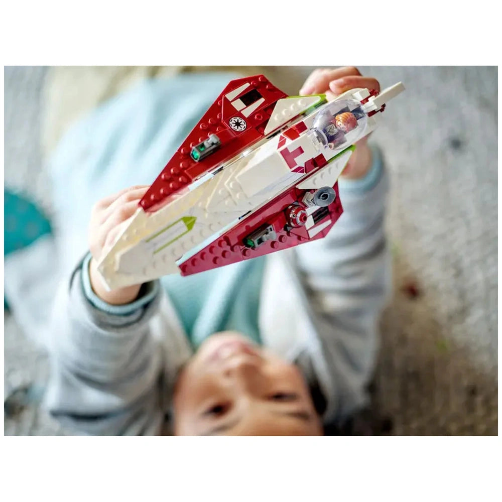 The LEGO® Star Wars™ Obi-Wan Kenobi's Jedi Starfighter is not only a fantastic playset but also a stunning display piece. Once completed, the starfighter measures over 2.5 inches high, 10 inches long, and 5 inches wide, making it an impressive addition to any collection. It can be proudly displayed between playtime adventures, showcasing the builder's hard work and creativity. This set is perfect for both play and display, appealing to collectors and young fans alike.