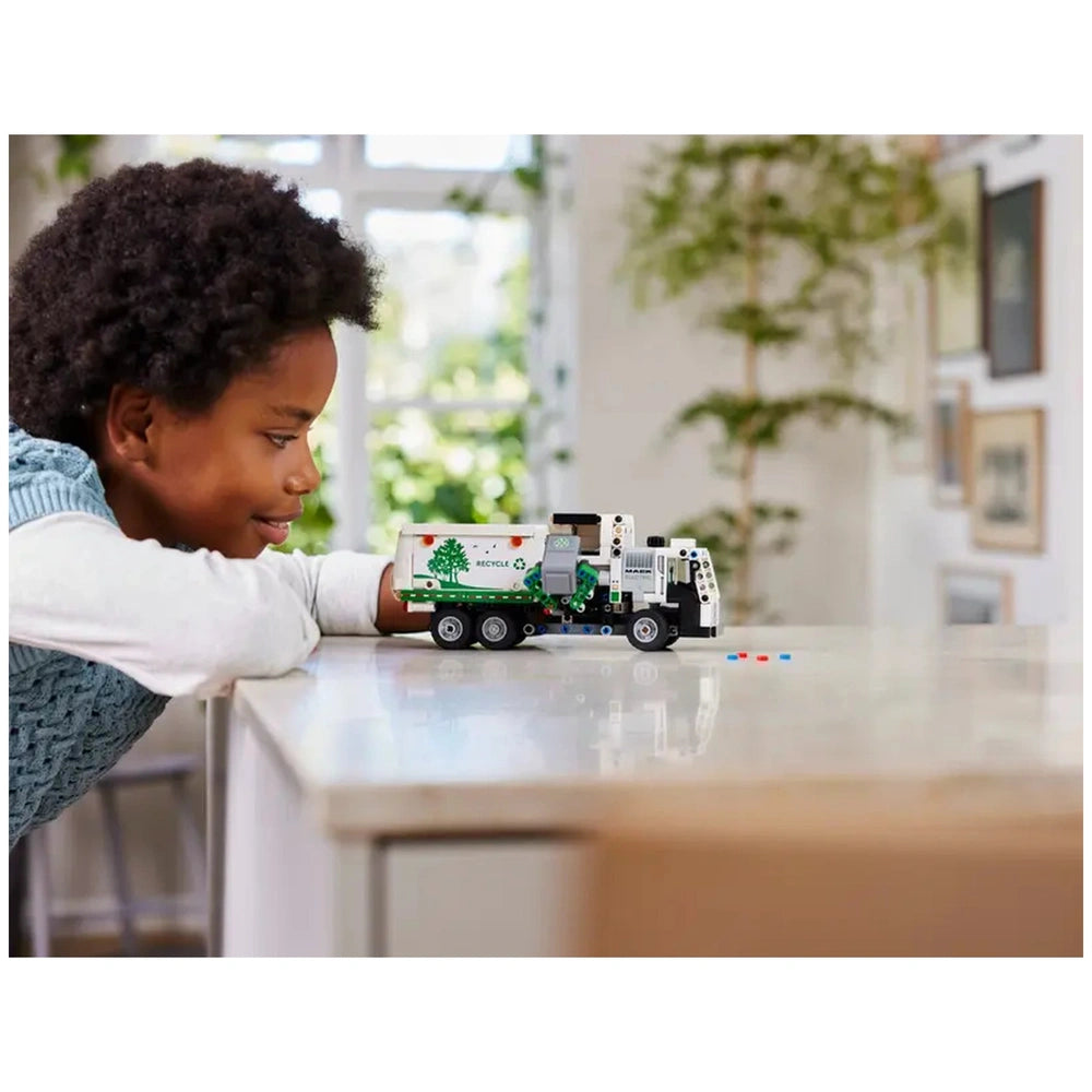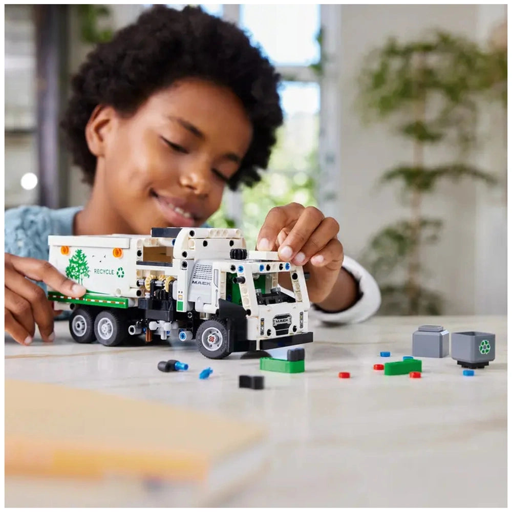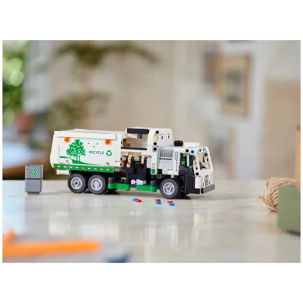 The LEGO Technic Mack LR Electric Garbage Truck is packed with features that mimic the functionality of its real-life counterpart. With a side loader mechanism, children can engage in role-play scenarios where they grab, lift, and tip garbage cans, simulating the essential work of waste management. The model's realistic movement allows kids to steer the truck into position using a gear element located atop the cab, enhancing their fine motor skills and hand-eye coordination. The opening doors reveal a detailed driver’s cab, inviting children to immerse themselves in the experience of being a garbage truck driver.
