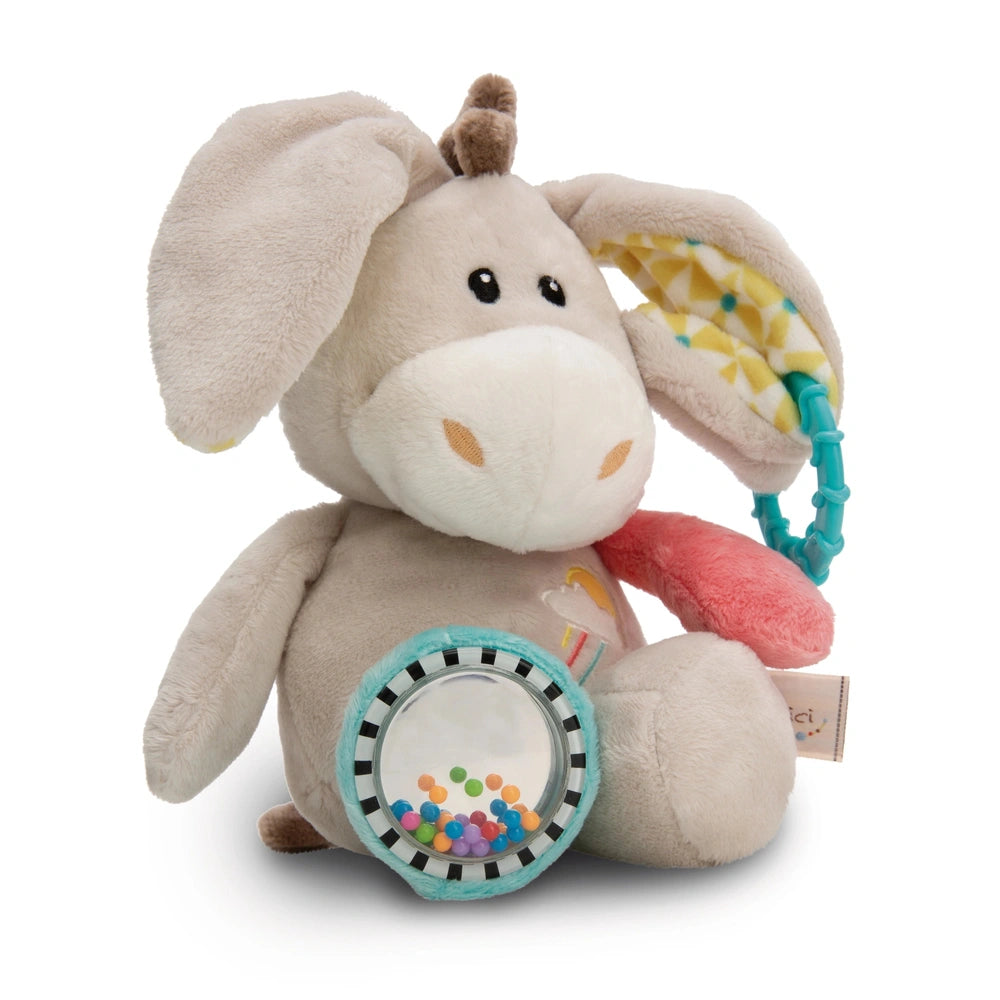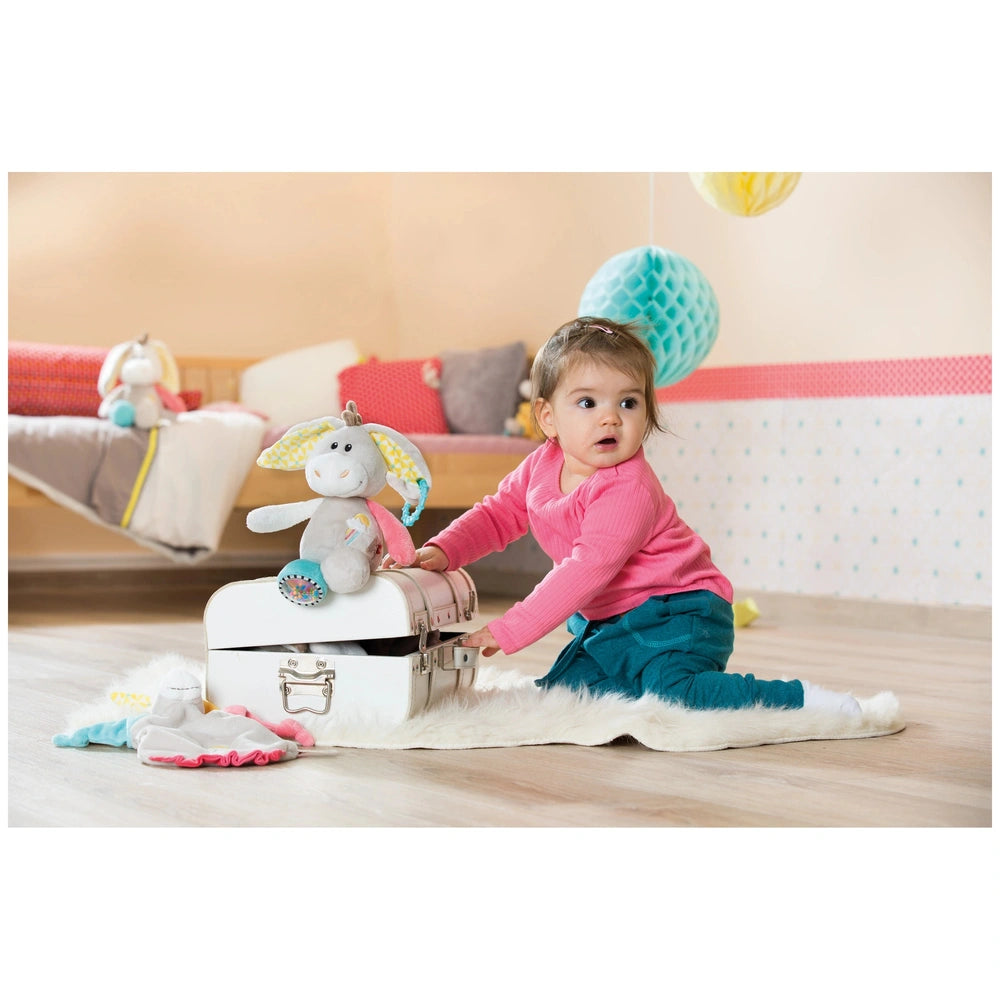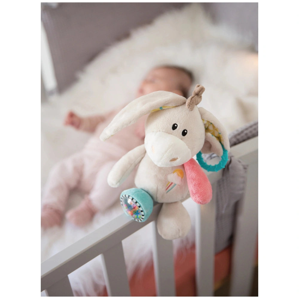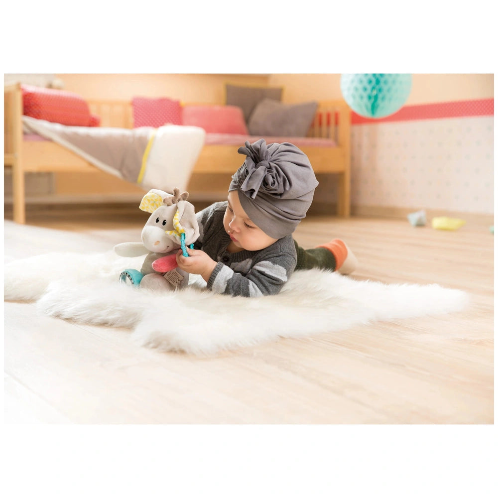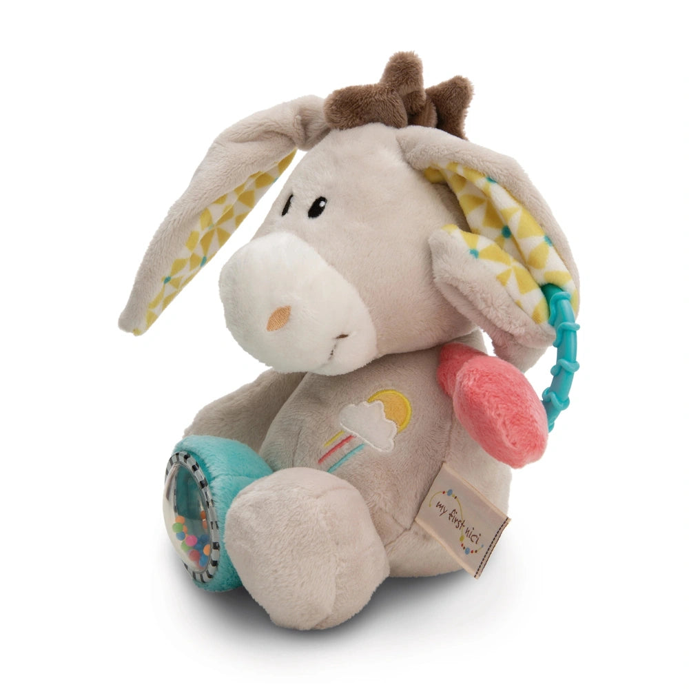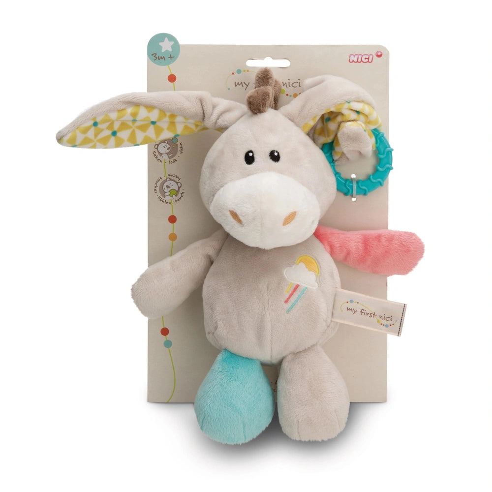 Introducing the NICI - My First NICI - Activity Cuddly Toy Donkey Muli, a delightful companion designed to engage and entertain your little one. This charming 28 cm donkey is not just a cuddly toy; it’s an interactive activity animal that combines comfort with stimulating features. Crafted from high-quality NICI plush, the Muli donkey is soft to the touch, making it perfect for snuggling during nap time or playtime.
