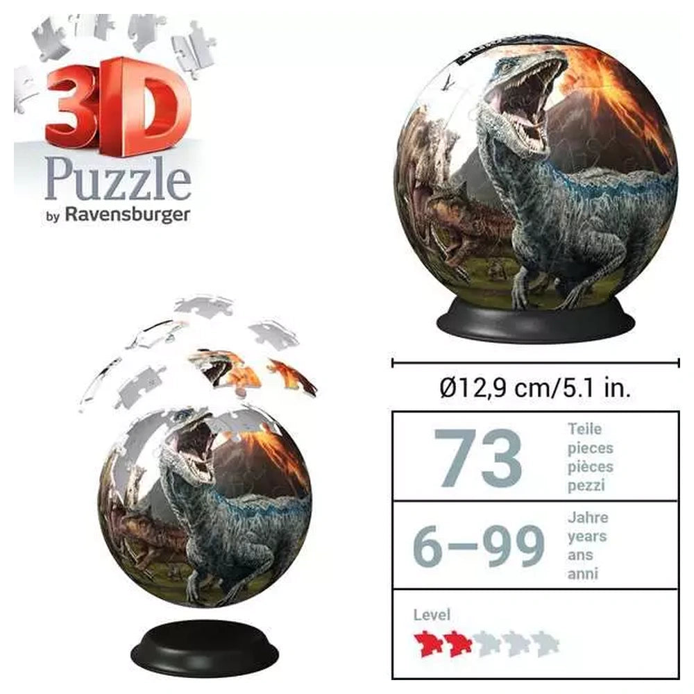 The Jurassic World Puzzle Ball features 72 pieces crafted from robust, high-quality plastic. Once assembled, the pieces form a perfectly round and stable 3D sphere measuring approximately 12.90 x 12.90 x 15.90 cm. The set is meticulously engineered to ensure a perfect fit without the need for glue or messy adhesives. It includes a total of 73 components, including the 72 puzzle pieces and a specialized base to showcase the finished dinosaur masterpiece.