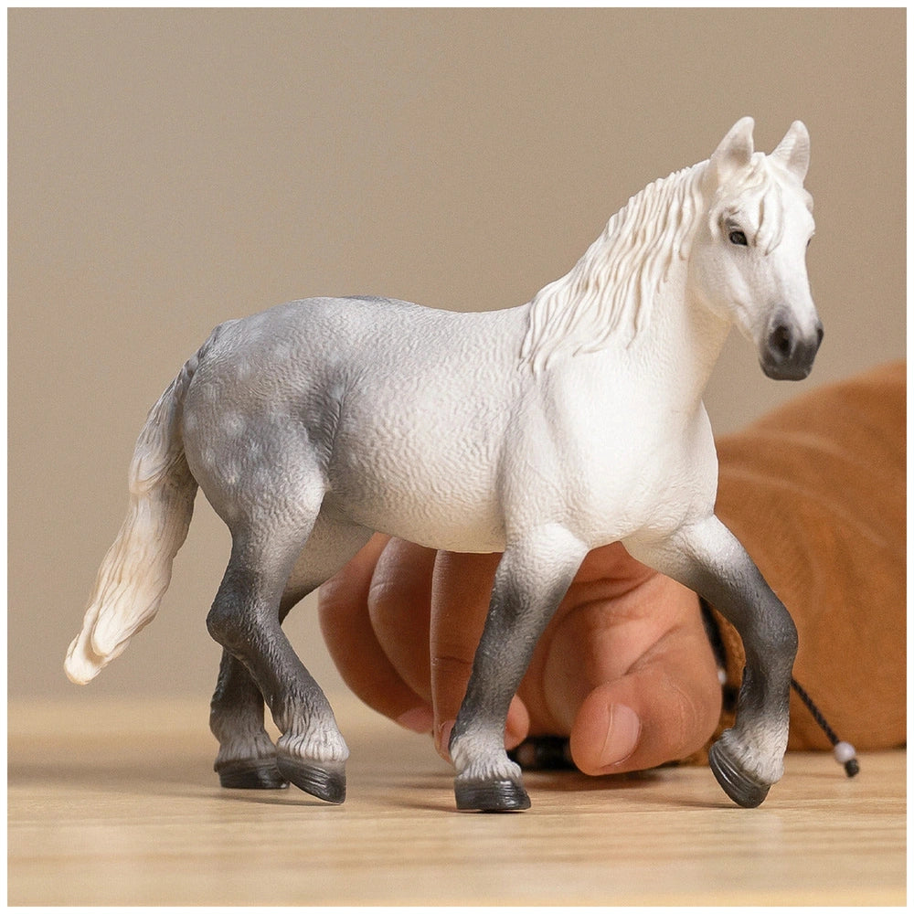 The Percheron Mare features a brilliant white coat on her head and chest, which seamlessly transitions into a striking gray-and-white flecked pattern on her flanks. Her strong, short legs and black muzzle add to her charm, making her a delightful addition to any collection. This figurine is designed with attention to detail, ensuring that every aspect of the Percheron Mare is accurately represented, from her gentle demeanor to her robust physique.
