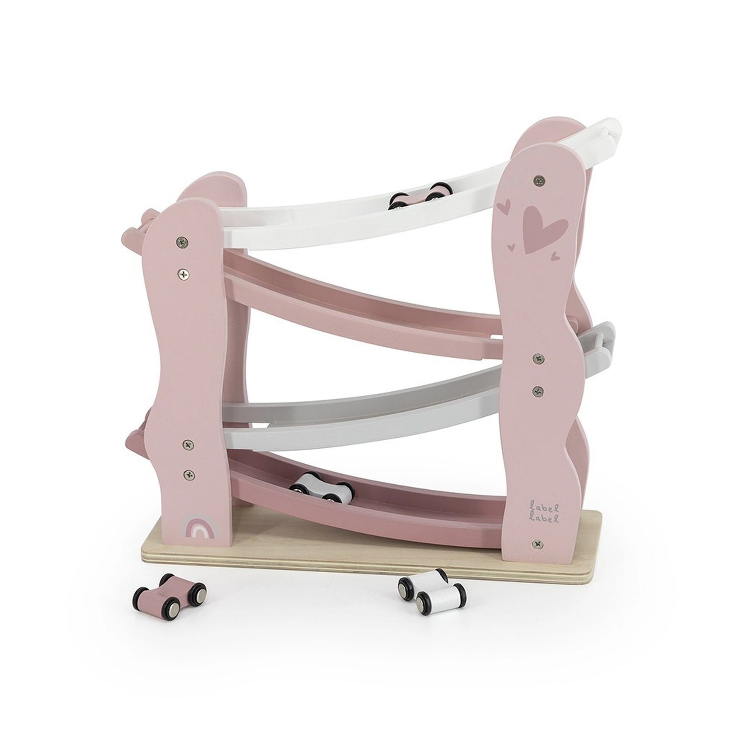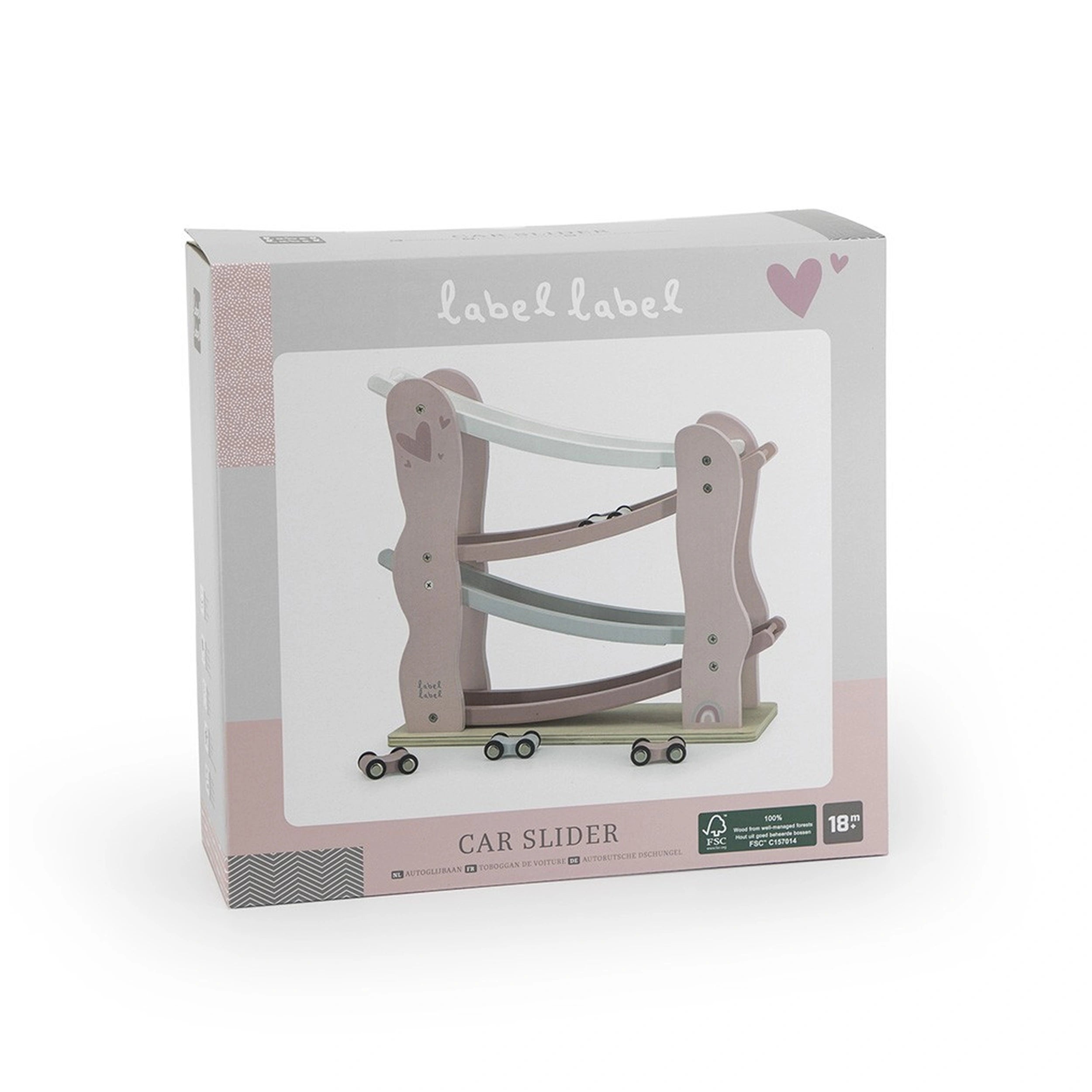 The Label Label Car Slider features a smooth slide that allows four charming cars, included in matching colors, to race down and navigate turns. This engaging activity encourages children to explore their motor skills as they learn to place the cars on the slide and watch them zoom down. The excitement of racing fosters a sense of competition and camaraderie, making it an ideal toy for playdates or family bonding time.