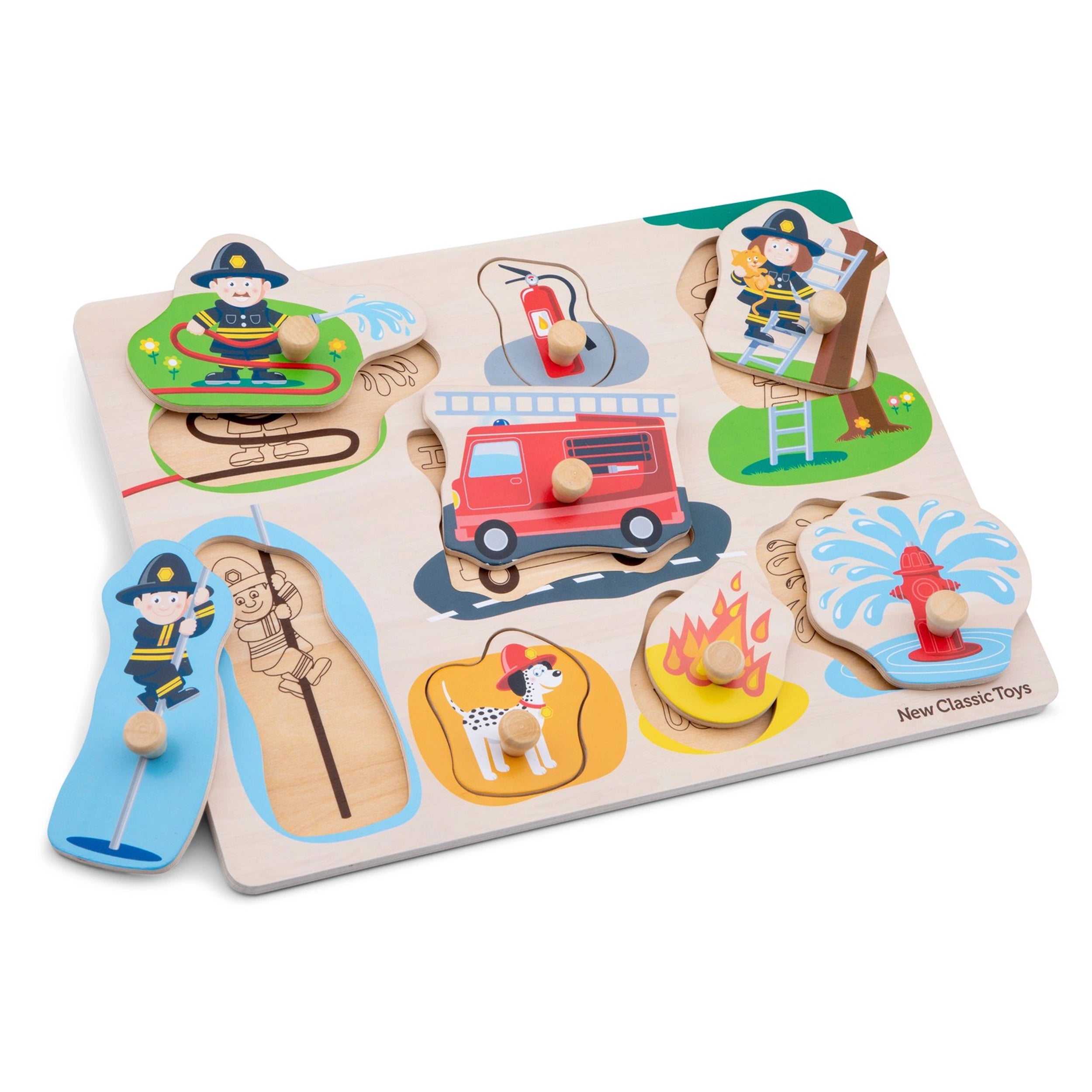 The New Classic Toys Fire Brigade Peg Puzzle features eight intricately designed pieces, each representing a key element of the firefighting world. Children will encounter a brave firefighter wielding a water hose, a trusty fire extinguisher, a heroic firefighter rescuing a cat from a tree, and even a playful dog. The puzzle also includes a fire engine, a fire hydrant, a flame, and a firefighter sliding down the fire pole. Each piece is not only visually appealing but also easy to grasp, thanks to the pegged handles that make it simple for toddlers to manipulate and place them back in their correct spots.