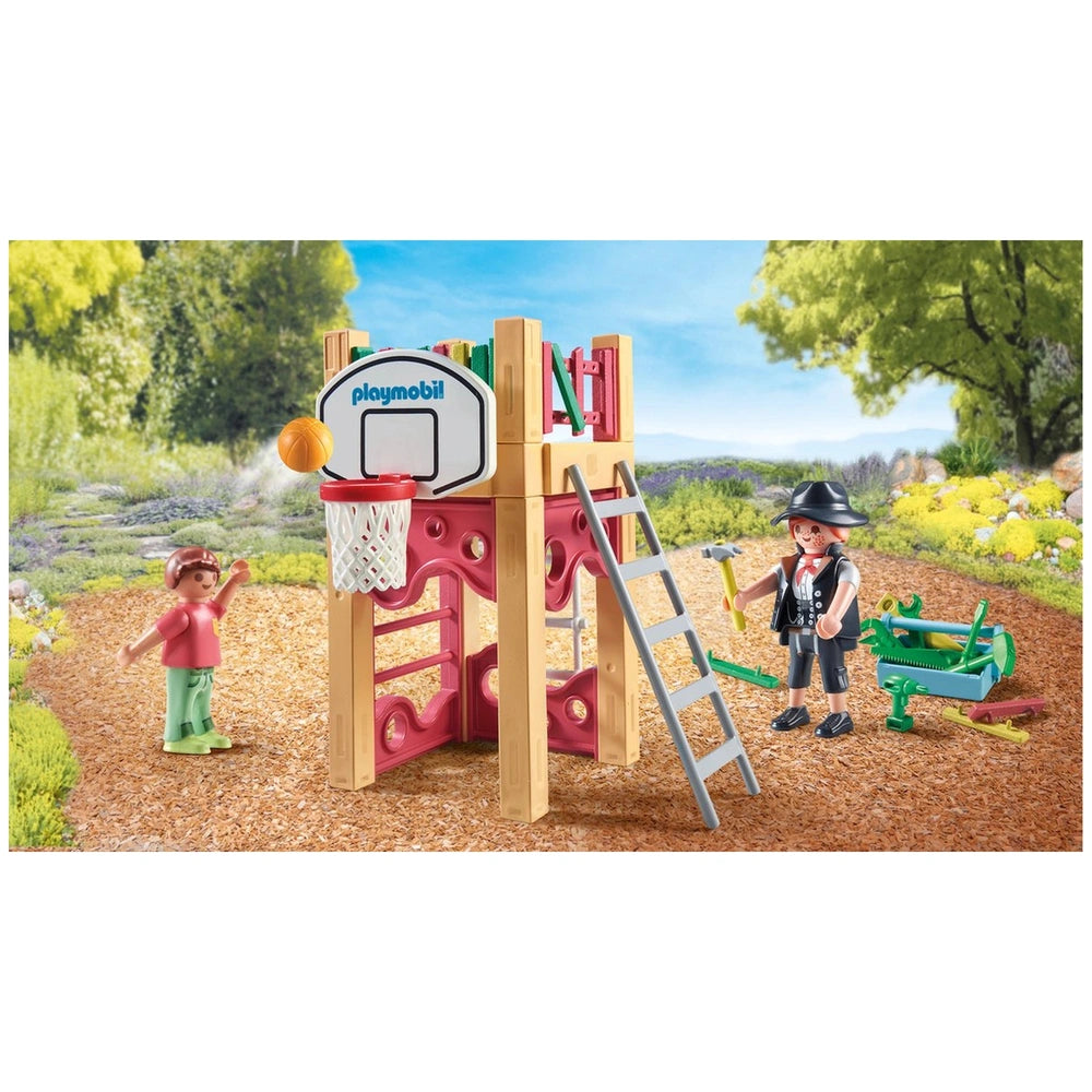 In this captivating scene, a skilled carpenter arrives at a playground in need of some tender loving care. The colorful play tower, complete with a basketball hoop, is waiting for a fresh coat of paint and some new wooden planks. Children will love watching as the carpenter expertly uses her toolbox to repair and enhance the play structure, fostering an appreciation for craftsmanship and the importance of teamwork. The anticipation builds as a young athlete eagerly awaits the completion of the tower, ready to test out the new features with his basketball.