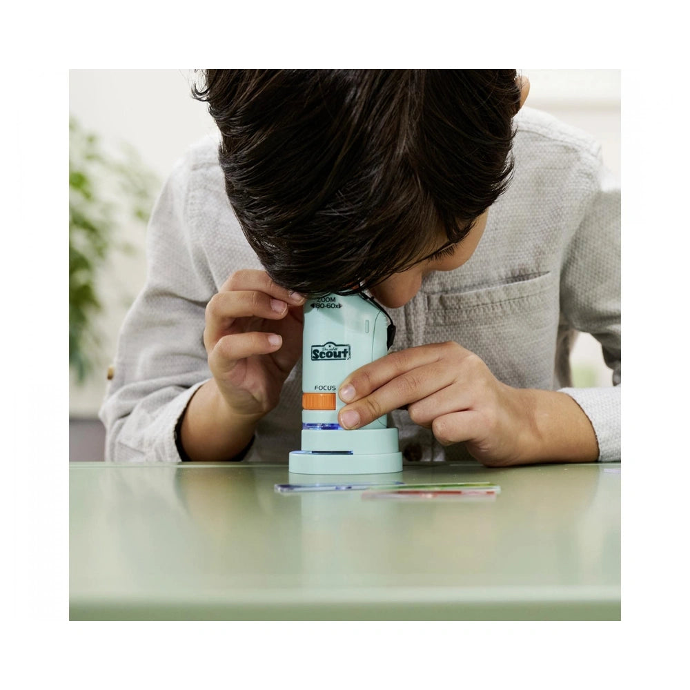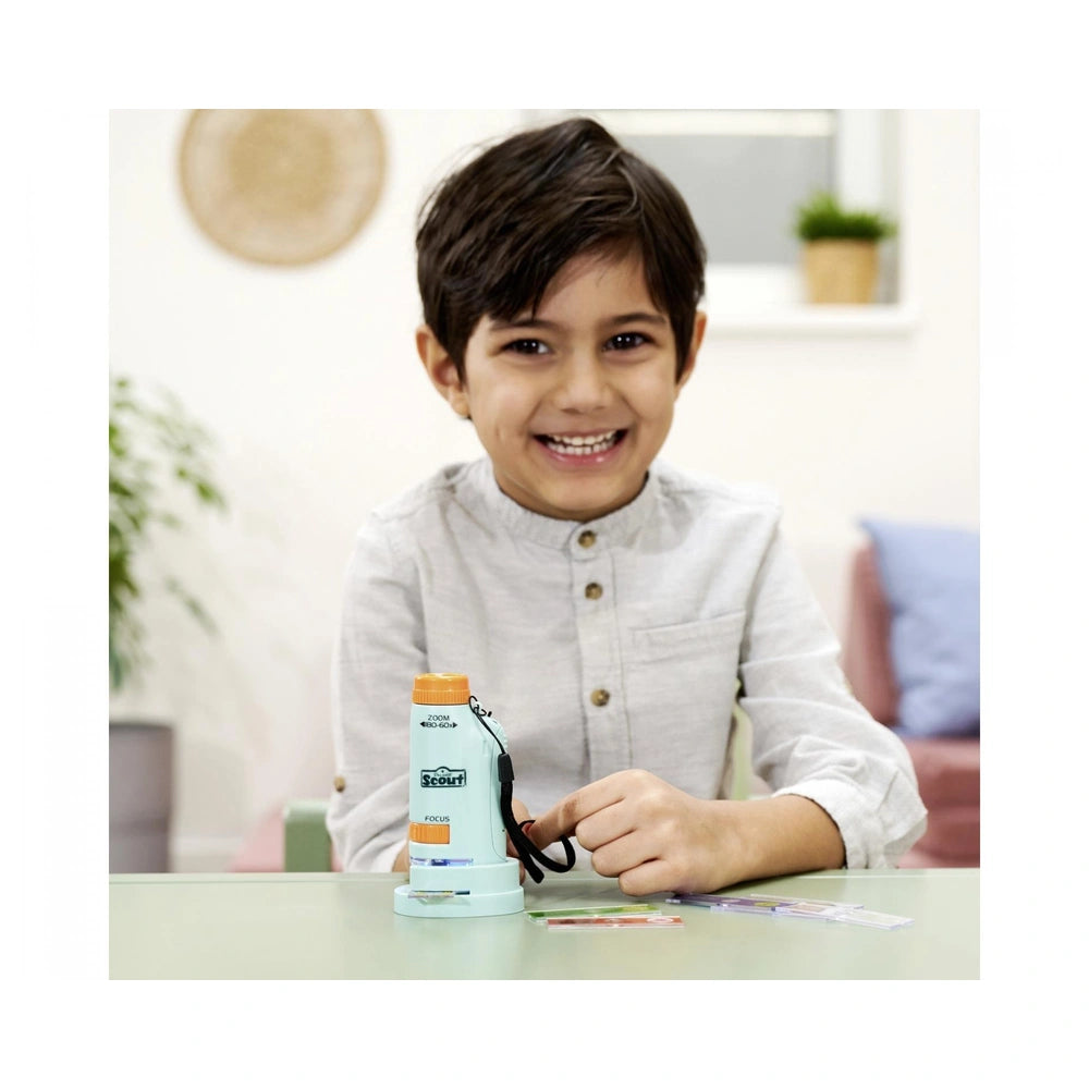 The Scout Pocket Microscope is engineered for curious minds, featuring a powerful magnification range of 60x to 180x that reveals intricate details invisible to the naked eye. Equipped with an integrated LED light, this microscope ensures bright and clear visibility, making it ideal for observing plants, insects, and minerals. The set includes four prepared slides showcasing various specimens, along with three empty slides for children to collect and examine their own findings, fostering a hands-on approach to learning.