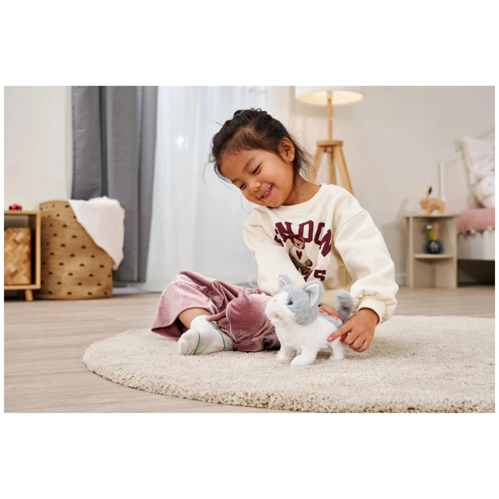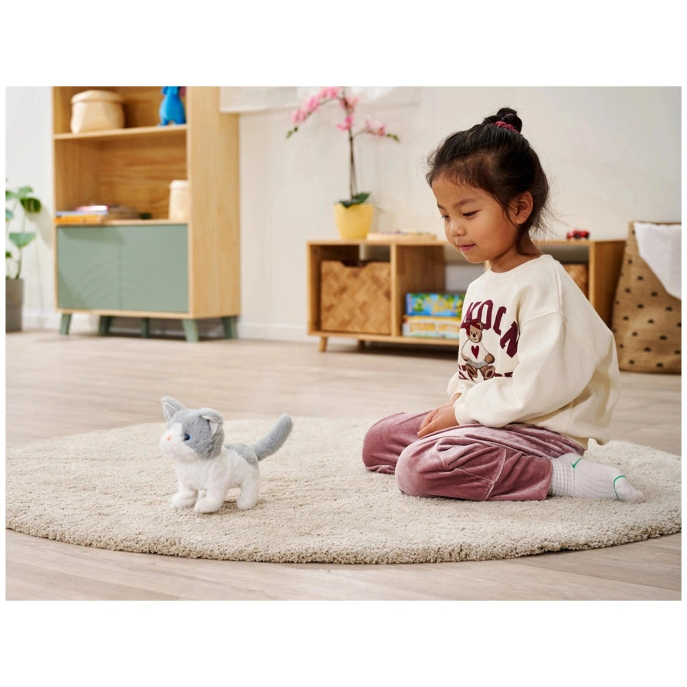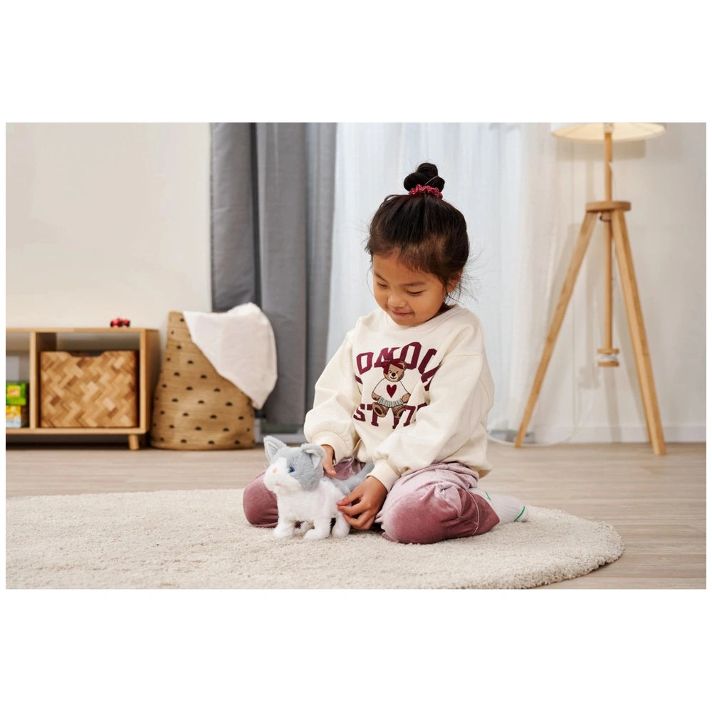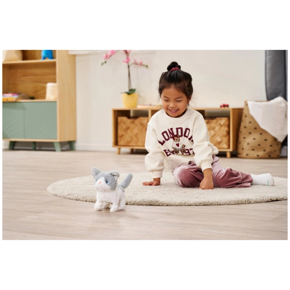 Introducing the Simba PetZoo Cat Plush Figure, a delightful blend of cuddly comfort and interactive play. This charming gray and white plush cat is designed to captivate the hearts of children aged three and up, providing an engaging experience that combines movement and sound. Crafted from ultra-soft plush material, this toy not only serves as a comforting companion but also encourages imaginative play, making it a perfect addition to any child's toy collection.