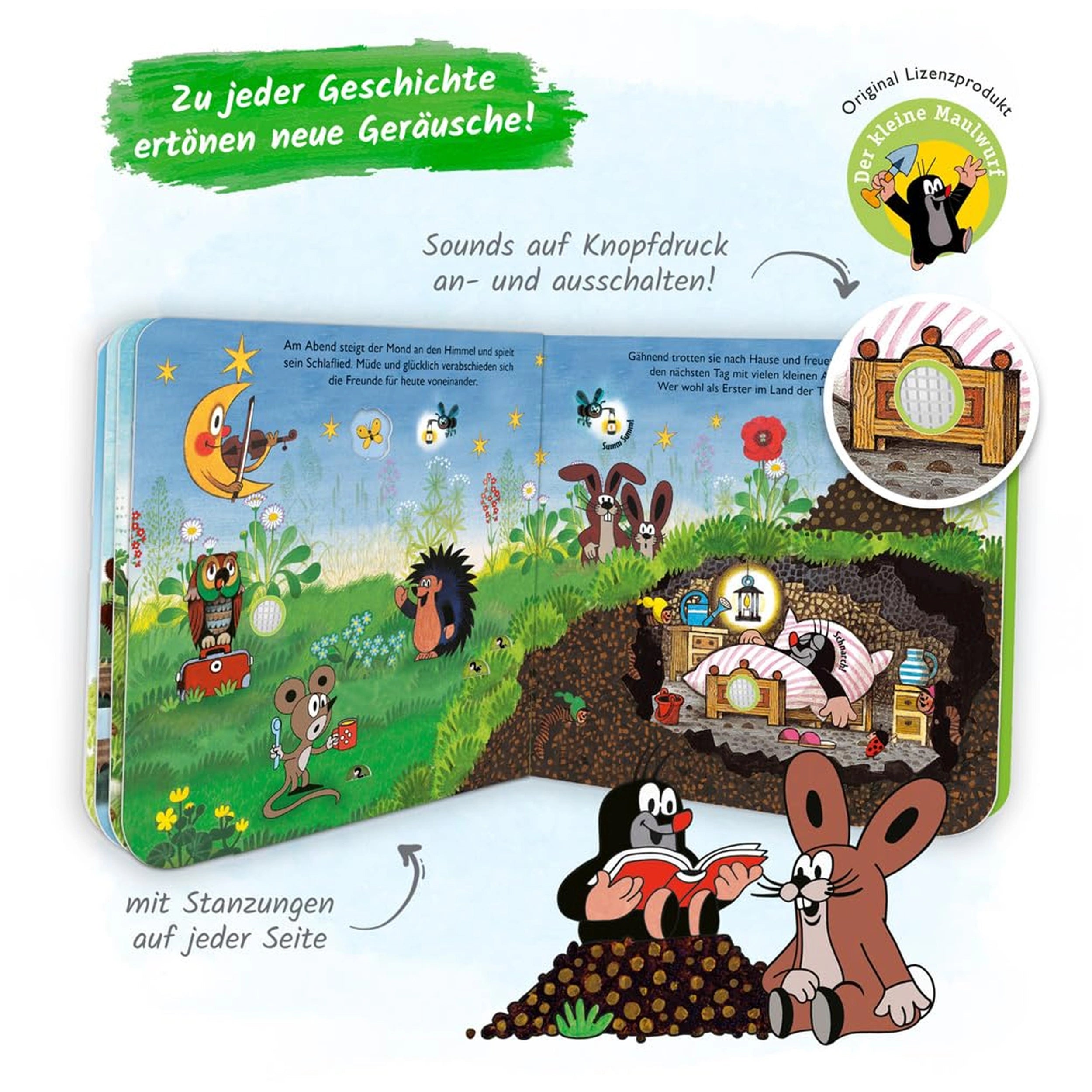 The "Trötsch Der kleine Maulwurf Soundbuch" features five cheerful picture stories that encourage children to look, listen, and marvel at the adventures of the little mole. Each page is adorned with colorful illustrations that not only tell a story but also come to life with the push of a button. The interactive sound elements enhance the reading experience, making it an ideal tool for parents and caregivers to engage children in a fun and educational way.